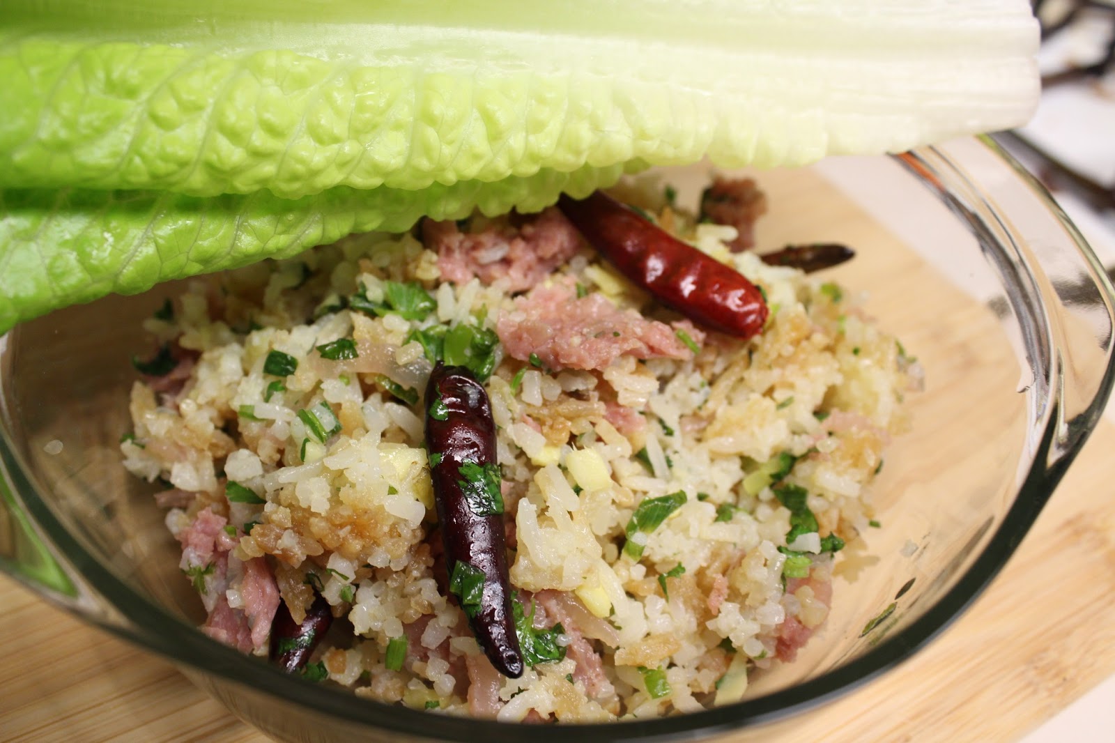 Nam, or Nam Khao, is a Laos dish consisting of crispy fried rice with fermented pork sausage (in Hmong, we call this sausage Nam). The pork sausage has a wonderful tangy and sour taste that goes perfectly with this crispy fried rice dish. Seems like every Nam Khao dish I've tried has been slightly different depending on the taste of the cook. I love this dish because you can add or take out some ingredients and it's still so delicious! It really is a dish that you can mold to your taste buds. My rendition has no fish sauce, peanuts, garlic/shallots or curry paste. Trust me, it's still super delicious and even better the next day!